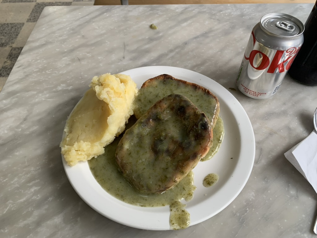 碎肉派與薯泥就很好理解,不過店家通常會問你要不要加“liquor”即歐芹醬(parsley sauce),這就增添了一些在地風味,至於歐芹醬的味道,個人是覺得很像偏鹹、冷掉的菠菜吻仔魚湯。吃到一半老闆還問我吃不吃辣,吃辣的話桌上有辣味醋可以加,也是一個我沒嘗試過的組合。平心而論,F Cooke Pie & Mash Hoxton這家碎肉派,派皮不夠酥脆,內餡也不夠多汁,相比之下我會更推薦M.Manze,不過體驗倫敦東北部風情,聽一下正宗考克尼口音也不錯。