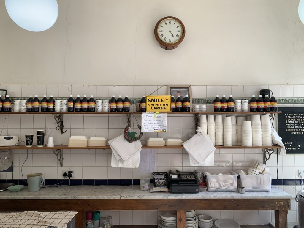 關於這家店的食物本身,這類型派店其實就是很典型的倫敦工人階級充飢食品,提供被稱為倫敦經典”a Cockney classic”的碎肉派、薯泥與鱔魚凍,即”Jellied eels” 跟 “Pie & Mash”,這兩道菜。鱔魚凍是以歐洲鰻鱺本身的膠質,煮出類似肉凍的食物,由於當年此魚種可以活在泰晤士河水質中,一抓一大把,因此成為廉價的蛋白質來源,貝克漢很愛吃,我則敬謝不敏。