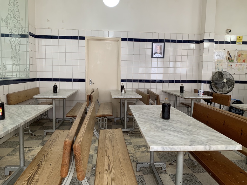 ​由於在非用餐時段拜訪,店內只有一對母子(兒子還順便寫功課),因此我剛好可以坐在男女主角戲中位置取景。店裡面的佈置跟桌椅都像學餐的用餐區,整潔但講求一個速戰速決,不像是劇中那種可以坐一下午的喫茶店,比較像是在地食堂。我很喜歡店裡面的老照片還有小孩的繪畫,繪畫紙外面還用壓克力板保護,不知道是不是現任店長的作品。
