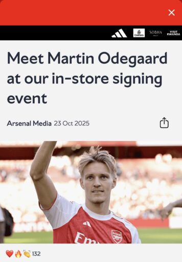 相較於今年另外一場Declan Rice簽名會,Martin Ødegaard這場簽名會明顯更有組織(規定也更嚴格),活動訊息在官方網站、官方App、主場電子看板都有出現,也包括官方推送簡訊(SMS)等。如果很想參加此類活動的話,記得廣告訊息要仔細看,然後不同官方新聞公告都時不時去刷一下。像這場我就沒有看到Email有通知,是在官網首頁看到的,而且首頁才過一兩天就看不到這個活動訊息,不知道是被其他新聞蓋過去,還是有意為之,我還搜尋關鍵字確定沒有像上次取消(Ødegaard肩傷)。