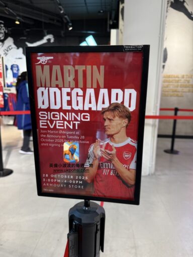 2025/10/28,到兵工廠主場參加重新舉辦的Martin Ødegaard簽名會,終於拿到人生第一件簽名球衣。有幸擠進150名的粉絲,不只可以坐在他旁邊跟Ødegaard簡短聊天,工作人員還會拿你的手機幫忙拍一堆照片,可說是收穫滿滿。儘管交流時間不多,但是大部分人問Ødegaard問題,他都會認真回答。像是我前面粉絲問他鬍子造型,或者問他覺得最帥的隊友之類,他都很認真的想答案,不會隨便敷衍。我實在沒什麼問題,只能對他說一句Jeg elsker deg(挪威語:我愛你),趁亂告白。